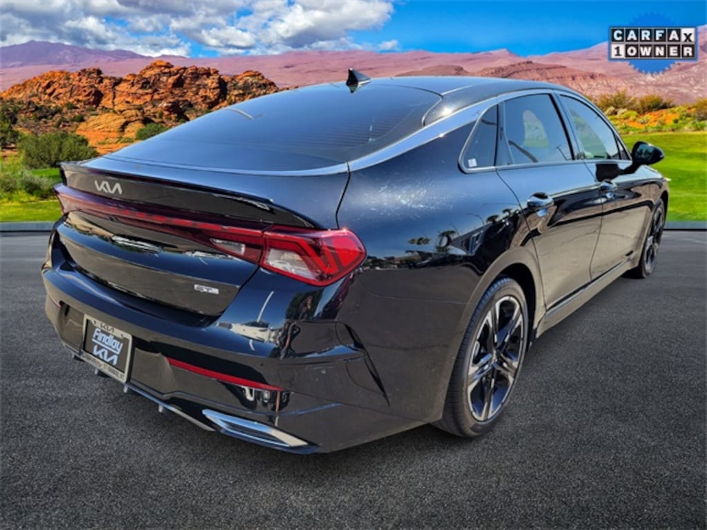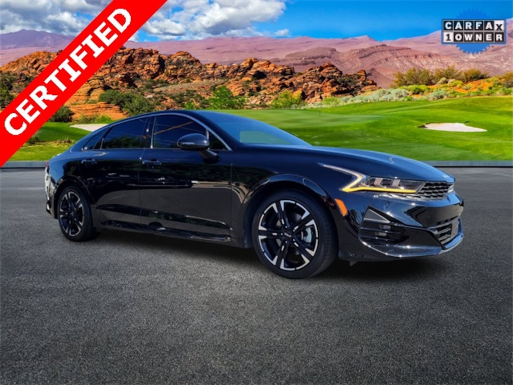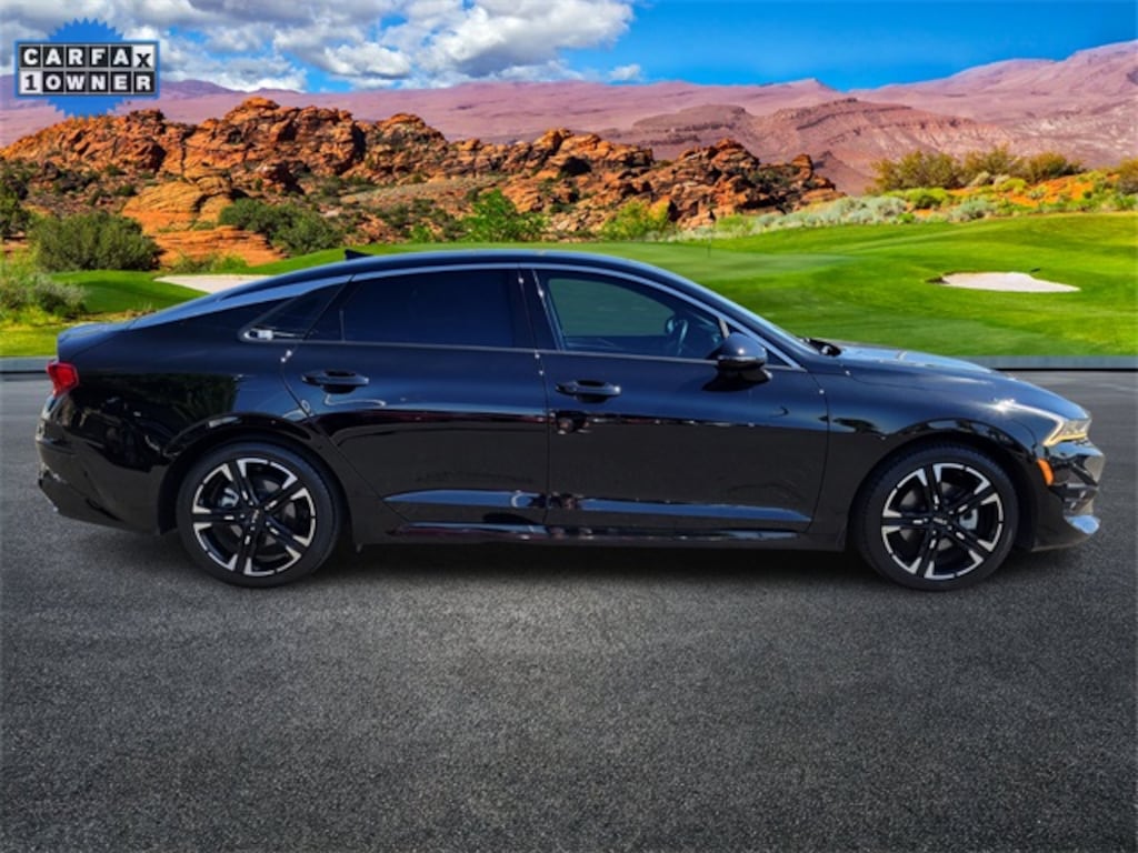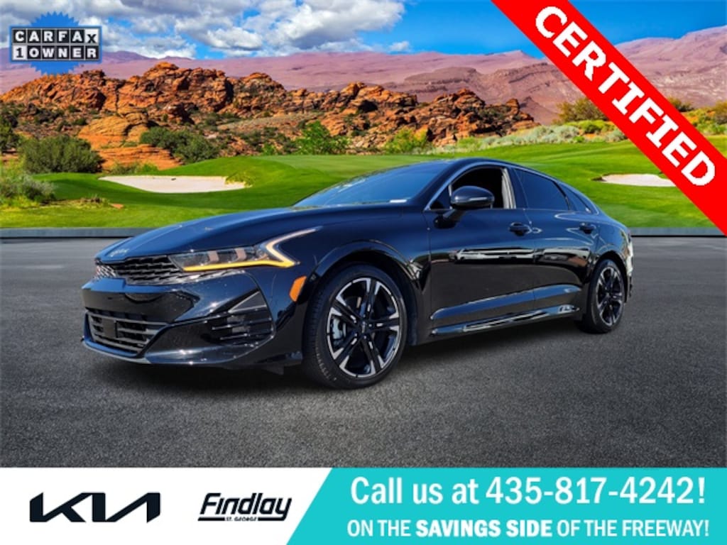 Welcome To Findlay Kia in St. George. All of our vehicles are hand picked and inspected for your peace of mind. Come see us (On the SAVINGS SIDE of the FREEWAY). This Kia K5 is equipped with the following options: GT-Line Panoramic Sunroof Package (LED Interior Lighting and Panoramic Sunroof), GT-Line Premium Package (Forward Collision Avoidance-Assist, Highway Driving Assist, LED Projection Headlamps, and Smart Cruise Control w/Stop & Go), GT-Line Red Interior Package, 4-Wheel Disc Brakes, 6 Speakers, ABS brakes, Air Conditioning, Alloy wheels, AM/FM radio: SiriusXM, Apple CarPlay & Android Auto, Auto High-beam Headlights, Automatic temperature control, Brake assist, Bumpers: body-color, Carpeted Floor Mats, Cloth/SynTex Seat Trim, Delay-off headlights, Driver door bin, Driver vanity mirror, Dual front impact airbags, Dual front side impact airbags, EC Mirror w/Homelink, Electronic Stability Control, Four wheel independent suspension, Front anti-roll bar, Front Bucket Seats, Front Center Armrest, Front dual zone A/C, Front fog lights, Front reading lights, Fully automatic headlights, Heated door mirrors, Heated Front Bucket Seats, Heated front seats, Heated steering wheel, Illuminated entry, Knee airbag, Leather steering wheel, LED Trunk Light, Low tire pressure warning, Navigation System, Occupant sensing airbag, Outside temperature display, Overhead airbag, Overhead console, Panic alarm, Passenger door bin, Passenger vanity mirror, Power door mirrors, Power driver seat, Power steering, Power windows, Radio data system, Radio: AM/FM/MP3 Audio System, Rear anti-roll bar, Rear seat center armrest, Rear side impact airbag, Rear window defroster, Remote keyless entry, Security system, Speed control, Speed-sensing steering, Split folding rear seat, Spoiler, Sport steering wheel, Steering wheel mounted audio controls, Tachometer, Telescoping steering wheel, Tilt steering wheel, Traction control, Trip computer, Turn signal indicator mirrors, Variably intermittent wipers, and Wheels: 18" Gloss Black Machined Finish Alloy.
