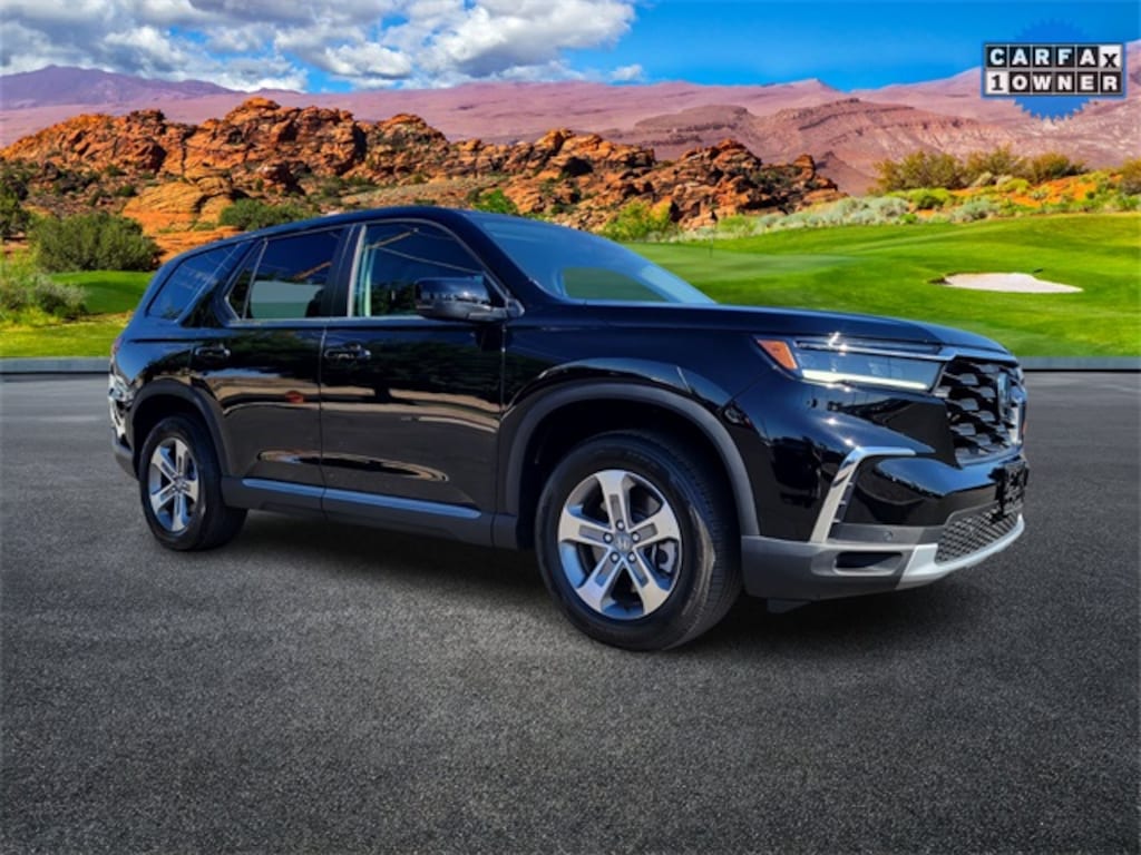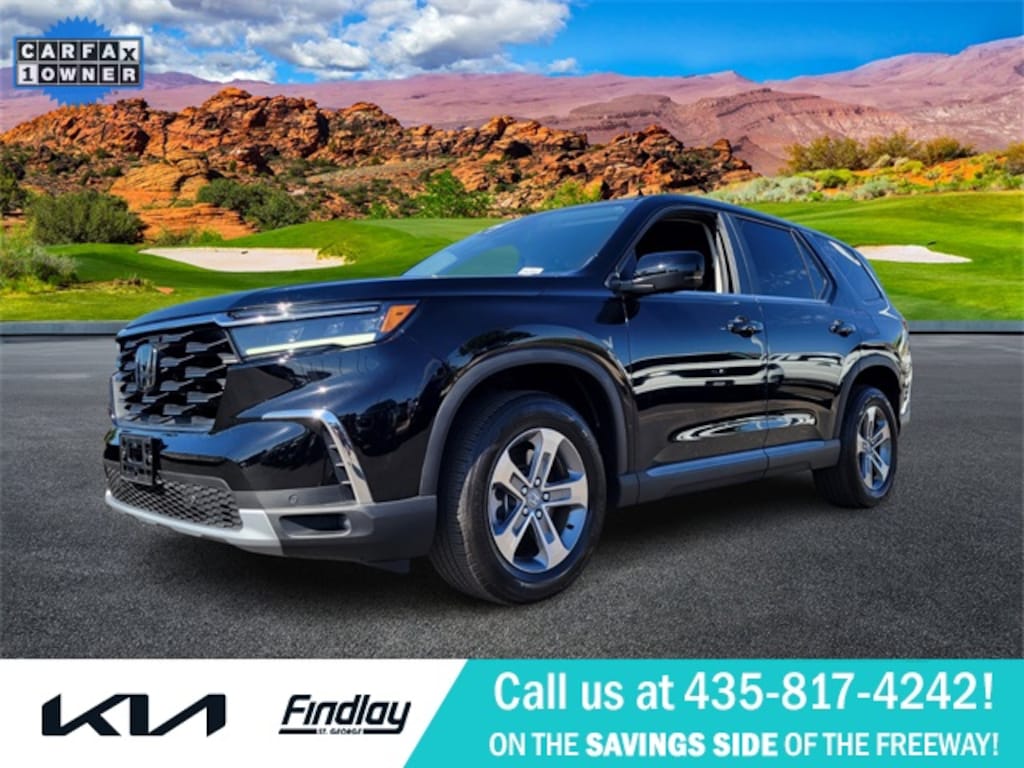 Welcome To Findlay Kia in St. George. All of our vehicles are hand picked and inspected for your peace of mind. Come see us (On the SAVINGS SIDE of the FREEWAY). This Honda Pilot is equipped with the following options: 3rd row seats: split-bench, 4-Wheel Disc Brakes, 9 Speakers, ABS brakes, Adaptive Cruise Control: Adaptive Cruise Control (ACC) with Low-Speed Follow, Air Conditioning, Alloy wheels, AM/FM radio: SiriusXM, Apple CarPlay/Android Auto, Auto High-beam Headlights, Auto-dimming Rear-View mirror, Automatic temperature control, Axle Ratio: 4.167, Blind Spot Information (BSI) System warning, Brake assist, Bumpers: body-color, Delay-off headlights, Driver door bin, Driver vanity mirror, Dual front impact airbags, Dual front side impact airbags, Electronic Stability Control, Emergency communication system: HondaLink Assist, Four wheel independent suspension, Front anti-roll bar, Front Bucket Seats, Front Center Armrest, Front dual zone A/C, Front fog lights, Front reading lights, Fully automatic headlights, Garage door transmitter: HomeLink, Heated door mirrors, Heated Front Bucket Seats, Heated front seats, Illuminated entry, Knee airbag, Lane departure: Lane Keeping Assist System (LKAS) active, Leather Seat Trim, Low tire pressure warning, Memory seat, Occupant sensing airbag, Outside temperature display, Overhead airbag, Overhead console, Panic alarm, Passenger door bin, Passenger vanity mirror, Power door mirrors, Power driver seat, Power Liftgate, Power passenger seat, Power steering, Power windows, Radio data system, Radio: 245-Watt Audio System, Rear air conditioning, Rear anti-roll bar, Rear reading lights, Rear window defroster, Rear window wiper, Reclining 3rd row seat, Remote keyless entry, Security system, Speed control, Speed-sensing steering, Speed-Sensitive Wipers, Split folding rear seat, Spoiler, Steering wheel mounted audio controls, Tachometer, Telescoping steering wheel, Tilt steering wheel, Traction control, Trip computer, Turn signal indicator mirrors, Variably intermittent wipers, and Wheels: 18" Machined Face Pewter Gray.