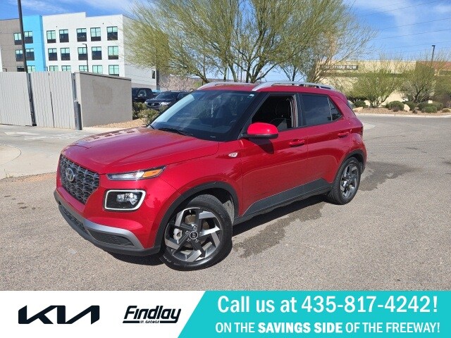 Welcome To Findlay Kia in St. George. All of our vehicles are hand picked and inspected for your peace of mind. Come see us (On the SAVINGS SIDE of the FREEWAY). This Hyundai Venue is equipped with the following options: Option Group 01, Cargo Package (Cargo Blocks, Cargo Net, and Cargo Tray), ABS brakes, Alloy wheels, Apple CarPlay & Android Auto, Automatic temperature control, Brake assist, Fully automatic headlights, Heated door mirrors, Heated Front Bucket Seats, Heated front seats, Leather Shift Knob, Leather steering wheel, Low tire pressure warning, Navigation System, Outside temperature display, Power door mirrors, Remote keyless entry, Security system, Speed-sensing steering, Steering wheel mounted audio controls, Telescoping steering wheel, 4-Wheel Disc Brakes, 6 Speakers, 6.483 Axle Ratio, 6.5J x 17" Alloy Wheels, Air Conditioning, AM/FM radio: SiriusXM, Auto High-beam Headlights, Bumpers: body-color, Carpeted Floor Mats, Cloth Seat Trim, Delay-off headlights, Driver door bin, Driver vanity mirror, Dual front impact airbags, Dual front side impact airbags, Electronic Stability Control, Emergency communication system, Front anti-roll bar, Front Bucket Seats, Front Center Armrest, Front reading lights, Front wheel independent suspension, Illuminated entry, Occupant sensing airbag, Overhead airbag, Overhead console, Panic alarm, Passenger door bin, Passenger vanity mirror, Power steering, Power windows, Radio: AM/FM/HD/SiriusXM Display Audio, Rear Bumper Applique, Rear Seat Cup Holder, Rear window defroster, Rear window wiper, Roof rack: rails only, Speed control, Split folding rear seat, Spoiler, Tachometer, Tilt steering wheel, Traction control, Trip computer, and Variably intermittent wipers.