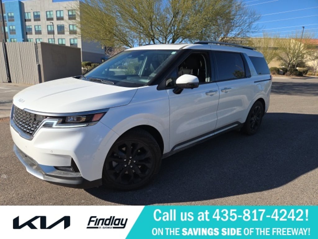 Welcome To Findlay Kia in St. George. All of our vehicles are hand picked and inspected for your peace of mind. Come see us (On the SAVINGS SIDE of the FREEWAY). This Kia Carnival is equipped with the following options: 3.51 Axle Ratio, 3rd row seats: split-bench, 4-Wheel Disc Brakes, ABS brakes, Air Conditioning, Alloy wheels, AM/FM radio: SiriusXM, Apple CarPlay & Android Auto, Auto High-beam Headlights, Automatic temperature control, Brake assist, Bumpers: body-color, Cargo Tray, Compass, Delay-off headlights, Driver door bin, Driver vanity mirror, Dual front impact airbags, Dual front side impact airbags, Electronic Stability Control, Emergency communication system, Exterior Parking Camera Rear, Four wheel independent suspension, Front anti-roll bar, Front Bucket Seats, Front Center Armrest, Front dual zone A/C, Front fog lights, Front reading lights, Fully automatic headlights, Heated & Ventilated Front Bucket Seats, Heated door mirrors, Heated front seats, Illuminated entry, Knee airbag, Leather Shift Knob, Leather steering wheel, Low tire pressure warning, Memory seat, Navigation System, Occupant sensing airbag, Outside temperature display, Overhead airbag, Overhead console, Panic alarm, Passenger door bin, Passenger vanity mirror, Power door mirrors, Power driver seat, Power Liftgate, Power passenger seat, Power steering, Power windows, Radio: AM/FM/HD Audio System, Rear air conditioning, Rear anti-roll bar, Rear reading lights, Rear window defroster, Rear window wiper, Reclining 3rd row seat, Remote keyless entry, Roof rack: rails only, Security system, Speed control, Speed-sensing steering, Split folding rear seat, Spoiler, Steering wheel mounted audio controls, Tachometer, Telescoping steering wheel, Tilt steering wheel, Traction control, Trip computer, Turn signal indicator mirrors, Variably intermittent wipers, Ventilated front seats, and Wheels: 7.5J x 19" Black Painted Alloy.