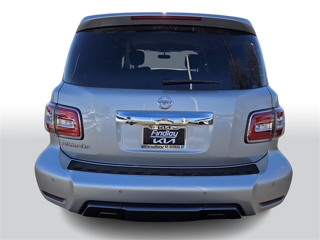 Welcome To Findlay Kia in St. George. All of our vehicles are hand picked and inspected for your peace of mind. Come see us (On the SAVINGS SIDE of the FREEWAY). This Nissan Armada is equipped with the following options: Driver Package (Auto-Dimming Interior Rear-View Mirror, Front Fog Lights, Power 60/40 3rd Row Seat, Power Lift Gate, and Trailer Towing Harness), 13 Speakers, 18" Alloy Wheels, 3rd row seats: split-bench, ABS brakes, AM/FM radio: SiriusXM, Auto-leveling suspension, Automatic temperature control, Brake assist, Fully automatic headlights, Heated Front Bucket Seats, Illuminated entry, Leather Shift Knob, Low tire pressure warning, Navigation System, Outside temperature display, Power door mirrors, Power driver seat, Radio: AM/FM/SXM/CD/MP3/HD, Rear air conditioning, Security system, Speed control, Steering wheel mounted audio controls, Tachometer, Telescoping steering wheel, Turn signal indicator mirrors, Variably intermittent wipers, 2.937 Axle Ratio, 2nd & 3rd Row Carpeted Mats, 4-Wheel Disc Brakes, Air Conditioning, Alloy wheels, Anti-whiplash front head restraints, Bumpers: body-color, CD player, Cloth Seat Trim, Cross Bars, Delay-off headlights, Driver door bin, Driver vanity mirror, Dual front impact airbags, Dual front side impact airbags, Electronic Stability Control, Emergency communication system: NissanConnect Services, Four wheel independent suspension, Front anti-roll bar, Front Bucket Seats, Front Center Armrest, Front dual zone A/C, Front reading lights, Heated front seats, Occupant sensing airbag, Overhead airbag, Overhead console, Panic alarm, Passenger door bin, Passenger vanity mirror, Power passenger seat, Power steering, Power windows, Radio data system, Rear anti-roll bar, Rear reading lights, Rear seat center armrest, Rear window defroster, Rear window wiper, Reclining 3rd row seat, Remote keyless entry, Roof rack: rails only, Speed-sensing steering, Speed-Sensitive Wipers, Split folding rear seat, Spoiler, Tilt steering wheel, Traction control, Trip computer, and Voltmeter.